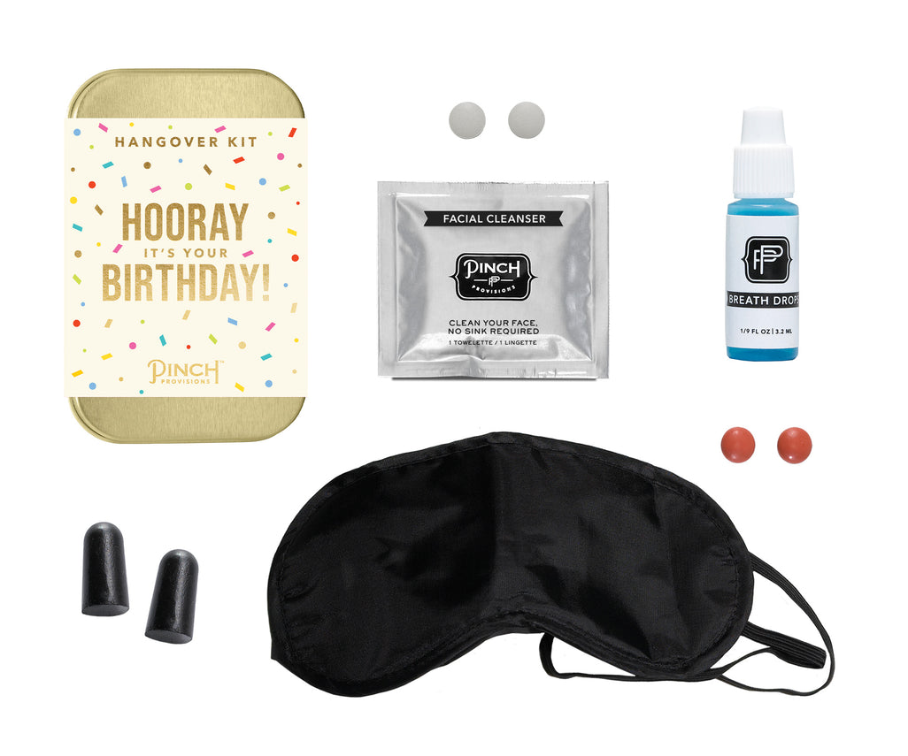 Hooray it's your birthday! Our Hangover Kits are the perfect solution for when you might have one too many. Now in a mini tin size, each kit contains an eye mask, ear plugs, a facial cleansing towelette, pain reliever, electrolytes, and breath drops.