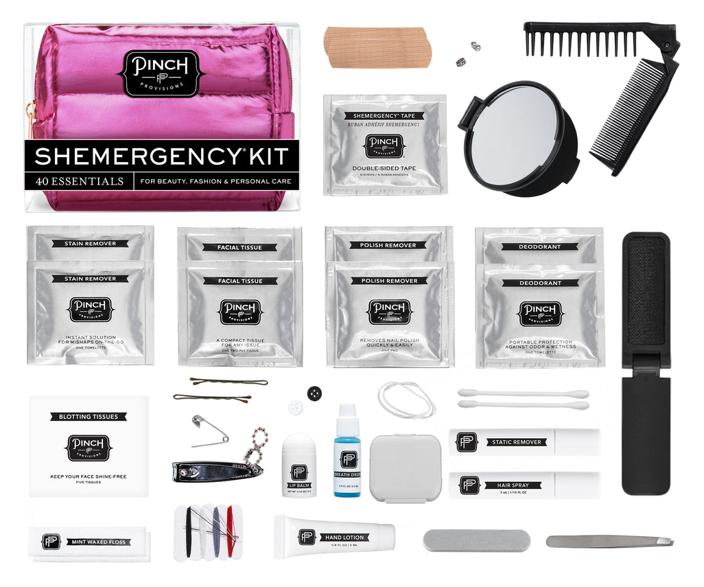 Our new Fuchsia Puffer Shemergency Kit offers the irresistible combination of puffer, bright pink, and a metallic sheen. The Shemergency Kit contains 40 emergency essentials: Hair spray, folding hair brush/comb, 2 clear elastics, 2 bobby pins, 2 earring backs, hand lotion, nail clipper, emery board, pill container, 2 nail polish remover pads, mending kit, safety pin, 5 double-sided tape strips, lint remover, 2 stain removing towelettes, static remover, breath freshener, lip balm, 2 single-use dental floss, 2 deodorant towelettes, extra buttons, 2 adhesive bandages, 2 facial tissues, blotting tissues, compact mirror, tweezers, and cotton swabs.