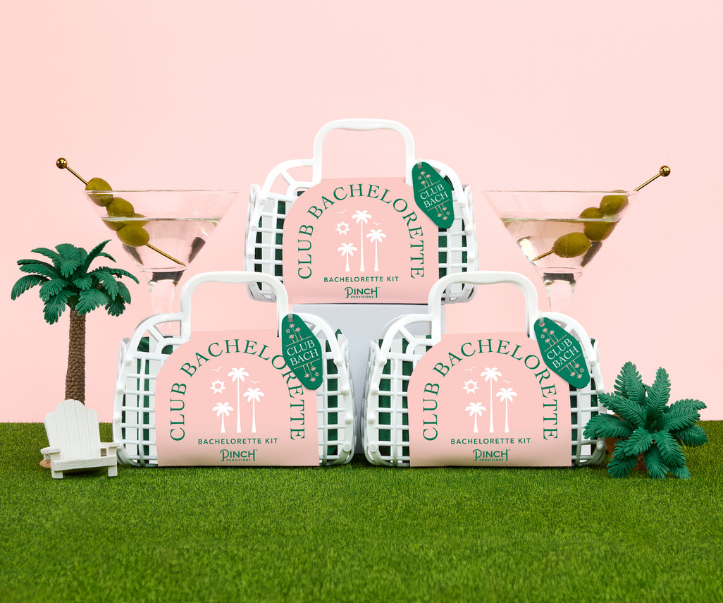 New for the I-Do Crew, it's the Bachelorette Kit by Pinch Provisions! Getting ready for a bachelorette party weekend has never been easier with this perfect, pre-packed swag bag for the bride-to-be and her babes. This adorable, petite white jelly tote—with a preppy peach and green design and vintage hotel keychain—contains 8 party and post-party essentials: